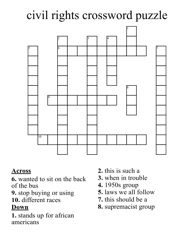 When you engage in solving a Civil Rights Crossword Puzzle, you’ll come across words like “segregation,” “equality,” “activism,” and “discrimination.” Each clue will challenge your knowledge and spark curiosity about historical events and important figures.