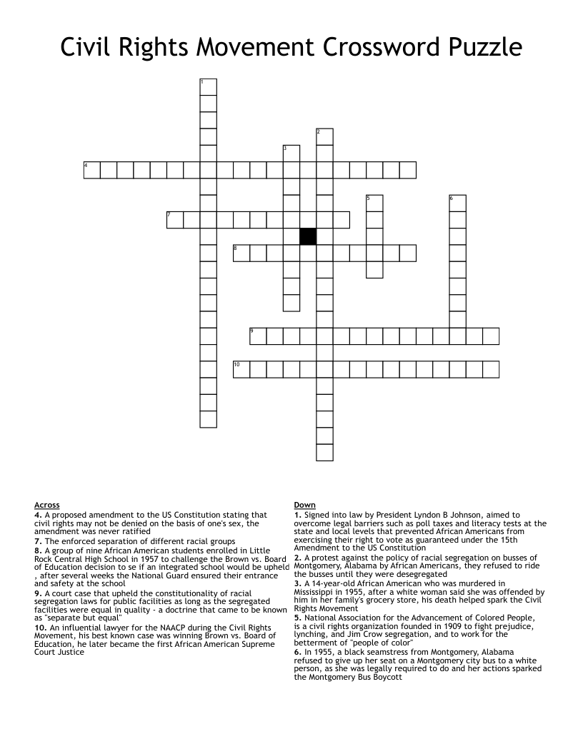 By solving the crossword, you’ll reinforce your knowledge of the Civil Rights Movement while having fun at the same time. It’s a great way to engage with the material and test your memory of key facts, events, and figures from this transformative era.