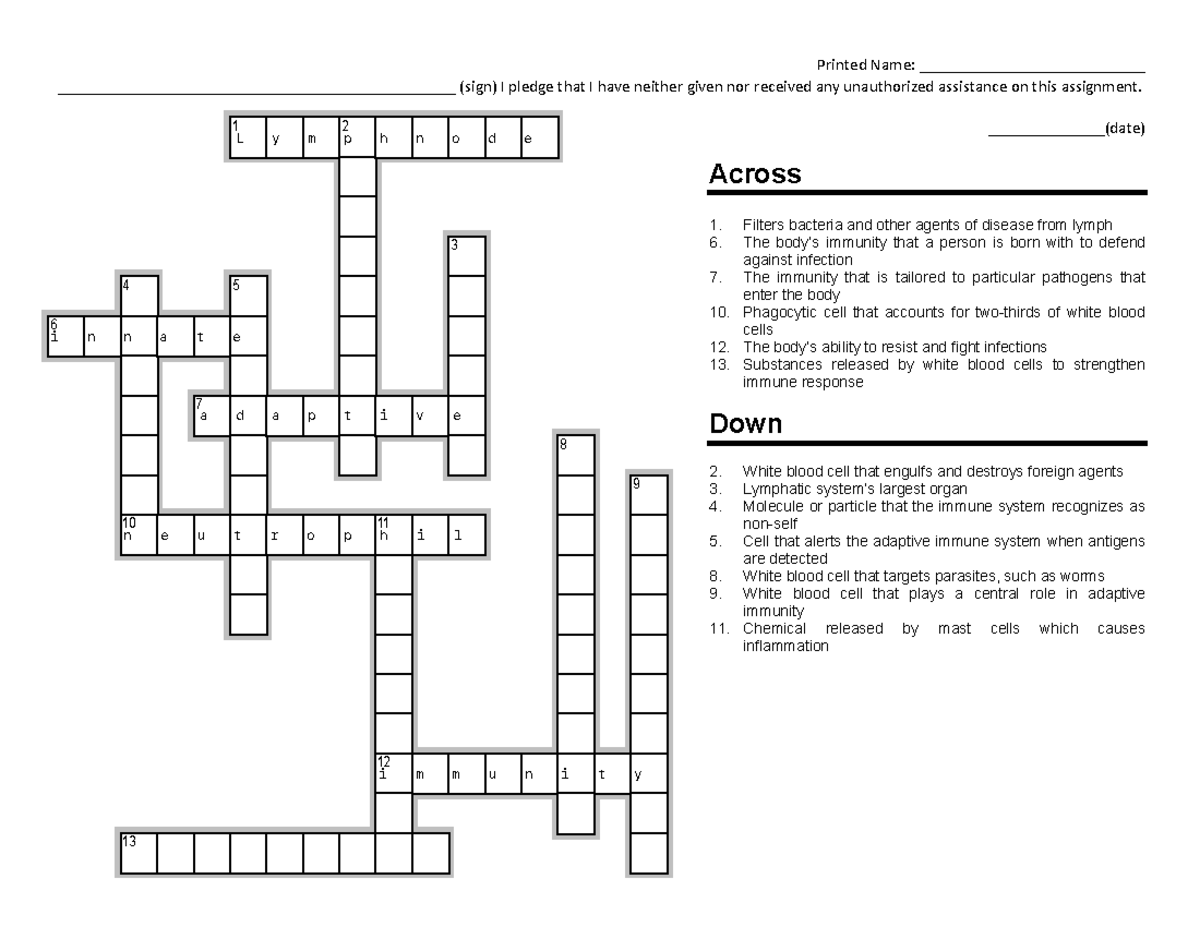 Immune System Crossword Puzzle Study Guide For Exam Prep Printed Name Studocu