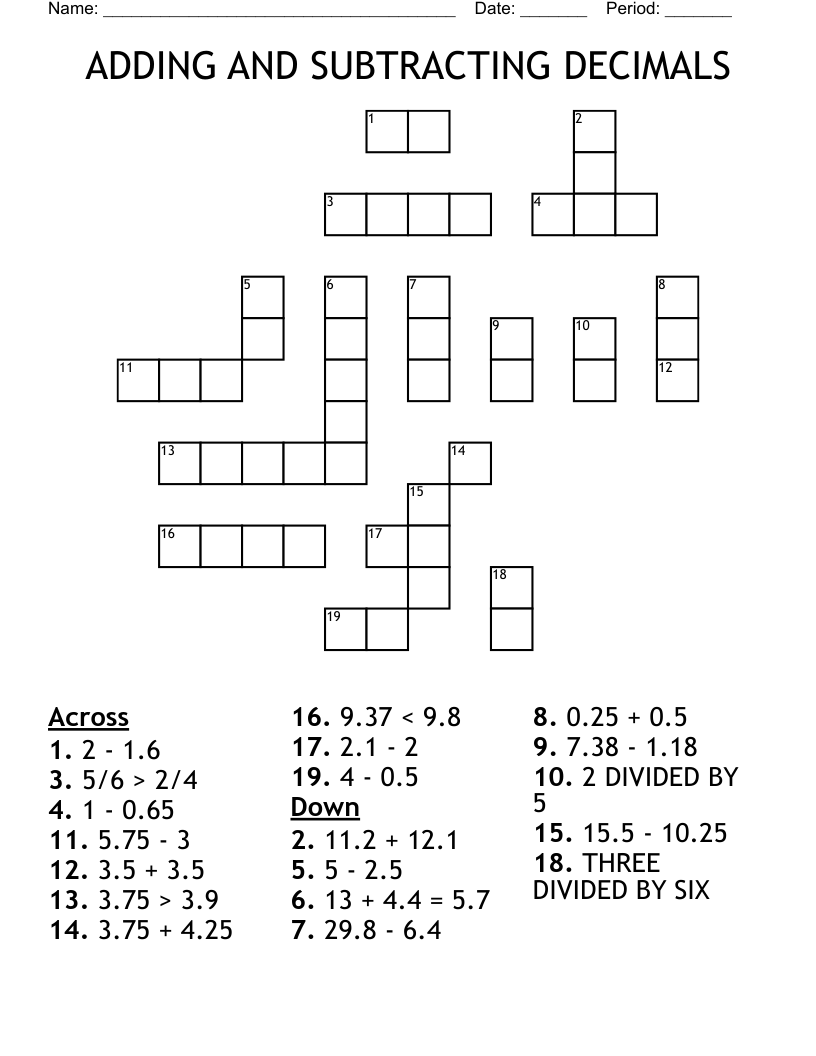 ADDING AND SUBTRACTING DECIMALS Crossword WordMint