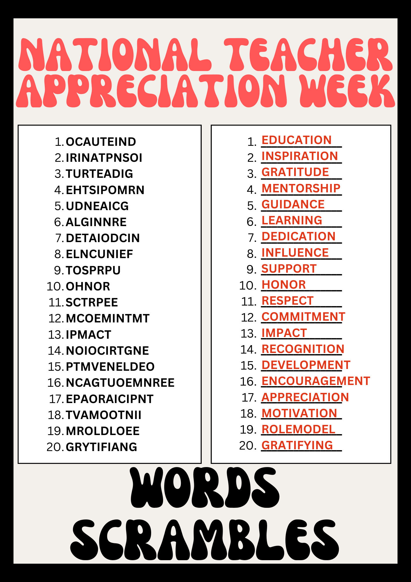National Teacher Appreciation Week Word Scrambles Puzzle Worksheet Printables Activity Made By Teachers